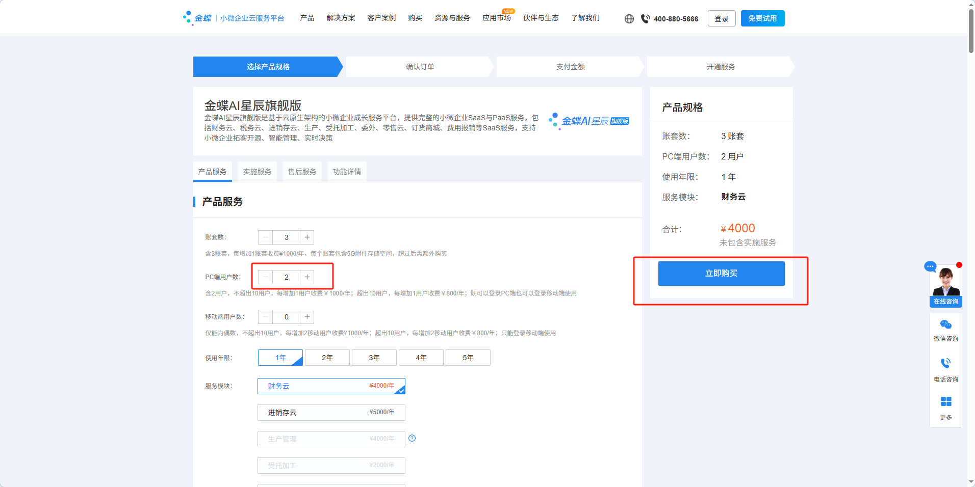 用户问金蝶产品的“用户”是什么意思?其实是指金蝶产品在购买时,会按用户数进行计算费用,不同的用户数对应不同的价格,比如购买金蝶AI星辰旗舰版3账套、2用户、1年、财务云模块,官网显示的价格是4000元/年。